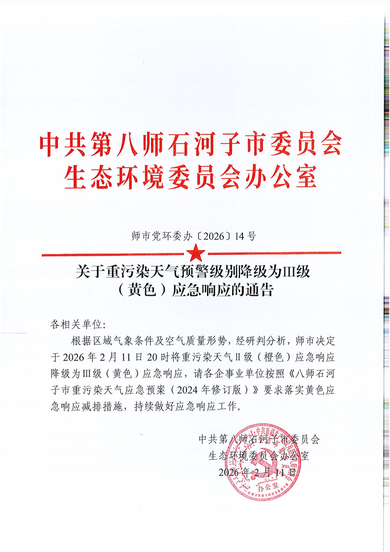 师市党环委办〔2026〕14号关于重污染天气预警级别降级为Ⅲ级(黄色)应急响应的通告