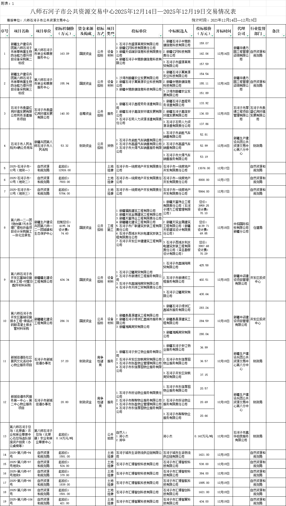 附件1.八师石河子市公共资源交易中心本周交易情况表