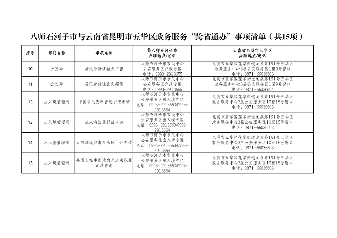 八师石河子市与云南省昆明市五华区“跨省通办”事项清单(共15项)