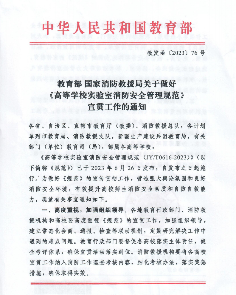 教育部 国家消防局关于发布教育行业标准《高等学校实验室消防安全管理规范》的通知