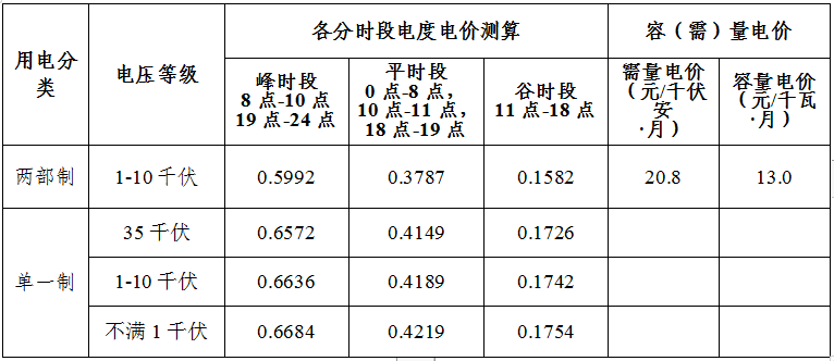 一般工商业用户根据用电容量选择执行单一制或两部制电价。单一制电价由上网电价、电量电价、上网环节线损费用、政府性基金及附加构成,两部制电价由上网电价、电量电价、容(需)量电价、上网环节线损费用、政府性基金及附加构成,其中峰时段、谷时段的上网电价、电量电价上下浮动60%。具体电价测算详见附表: