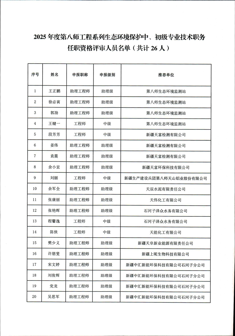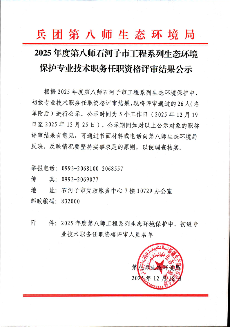 2025年度第八师石河子市工程系列生态环境保护专业技术职务任职资格评审结果公示