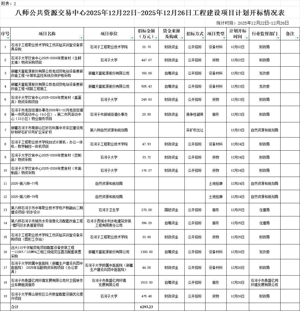 2.八师石河子市公共资源交易中心下周开标项目情况表