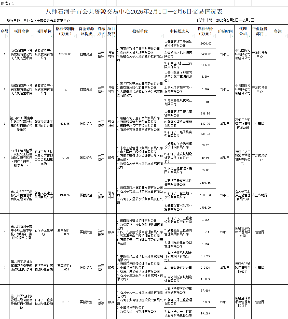 附件1.八师石河子市公共资源交易中心2026年2月1日-2月6日交易情况表