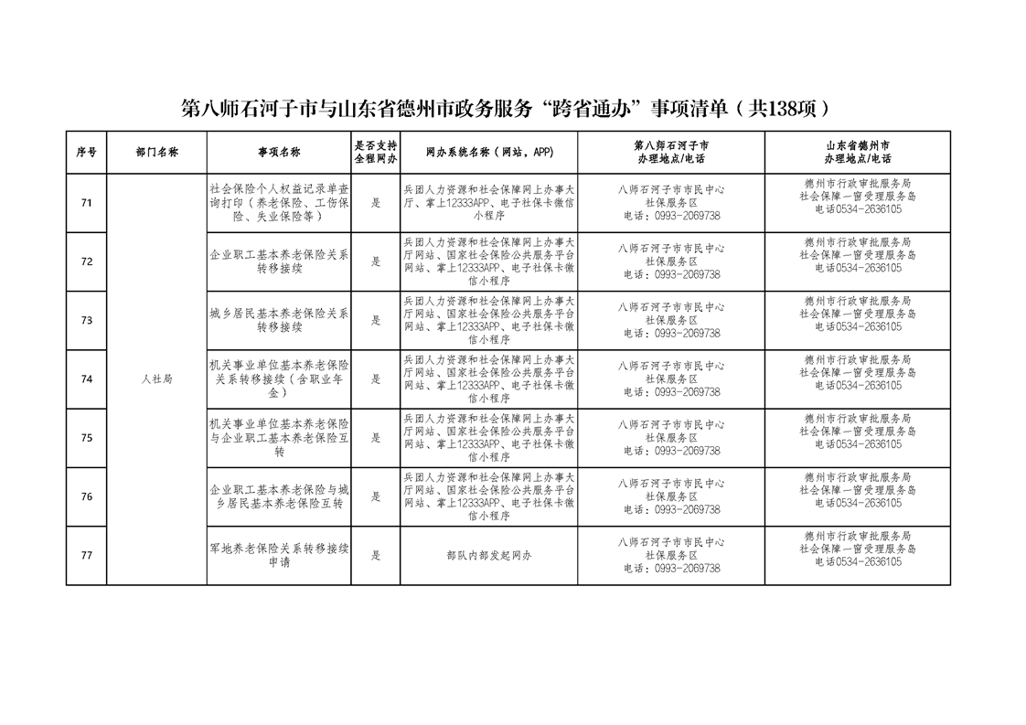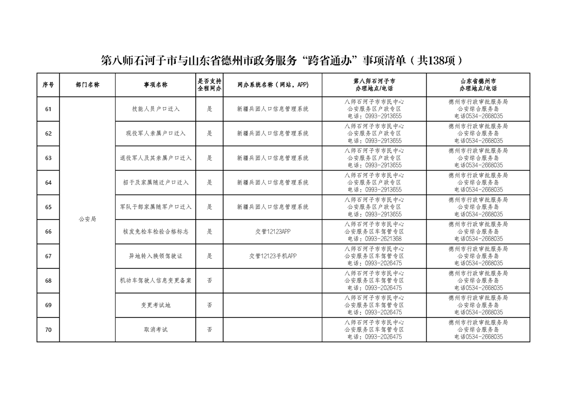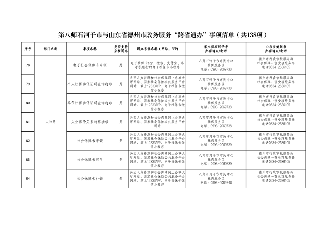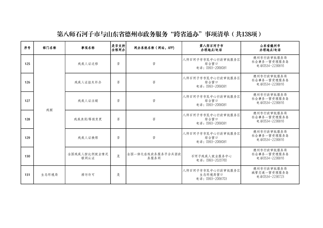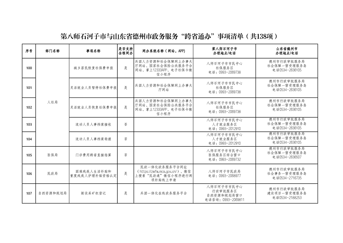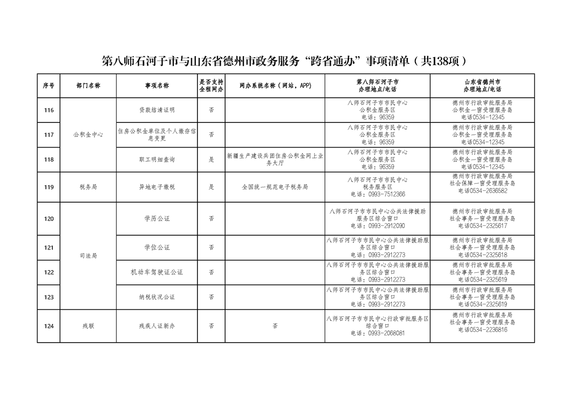 八师石河子市与山东省德州市“跨省通办”事项清单(共138项)