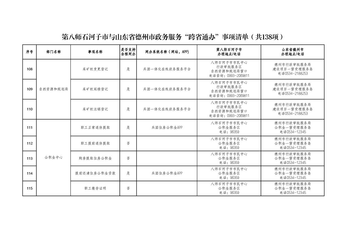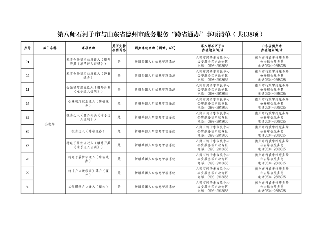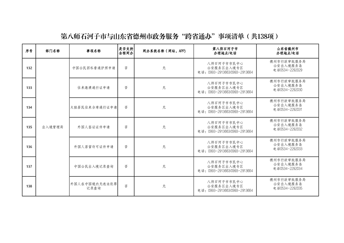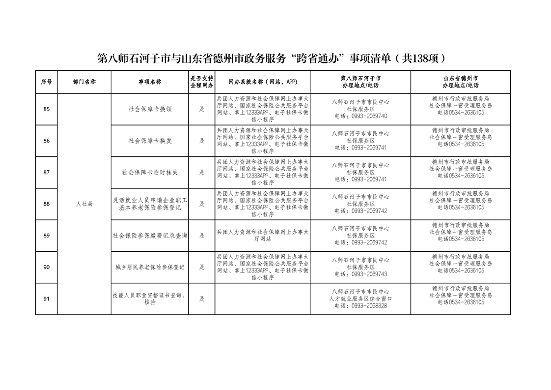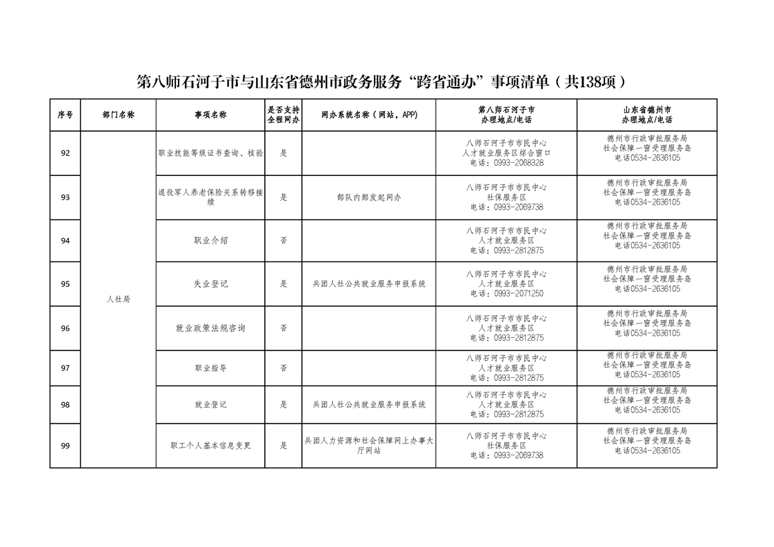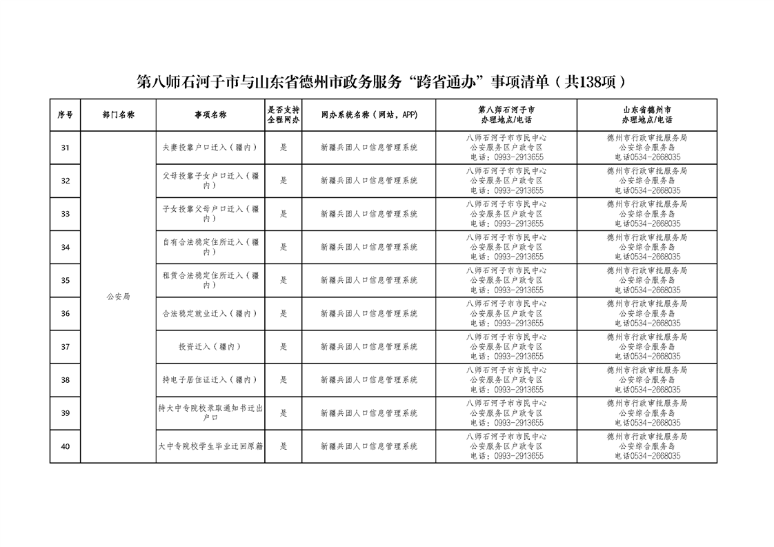 八师石河子市与山东省德州市“跨省通办”事项清单(共138项)