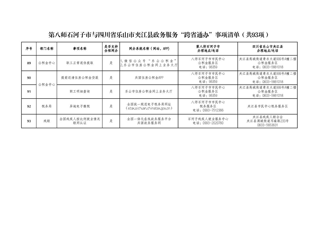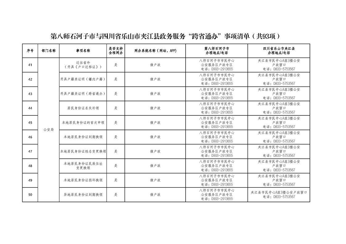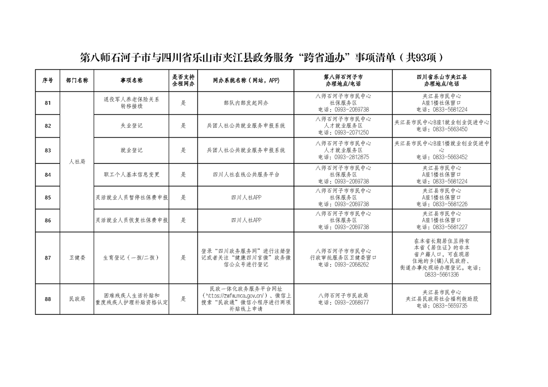 八师石河子市与四川省乐山市夹江县“跨省通办”事项清单(共93项)