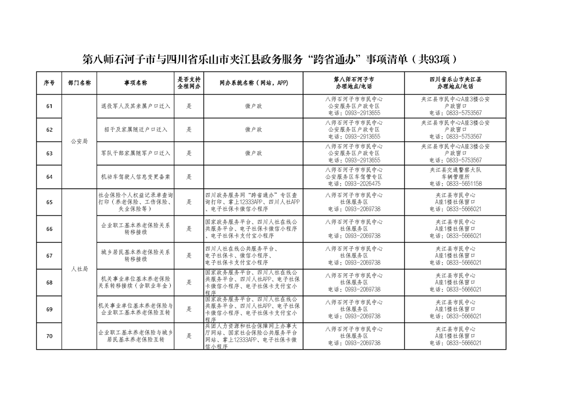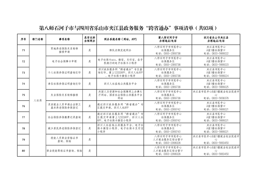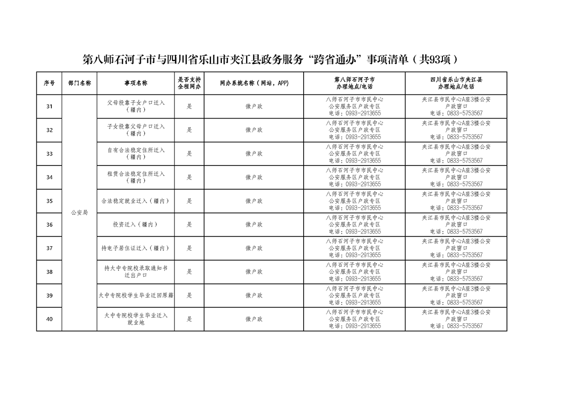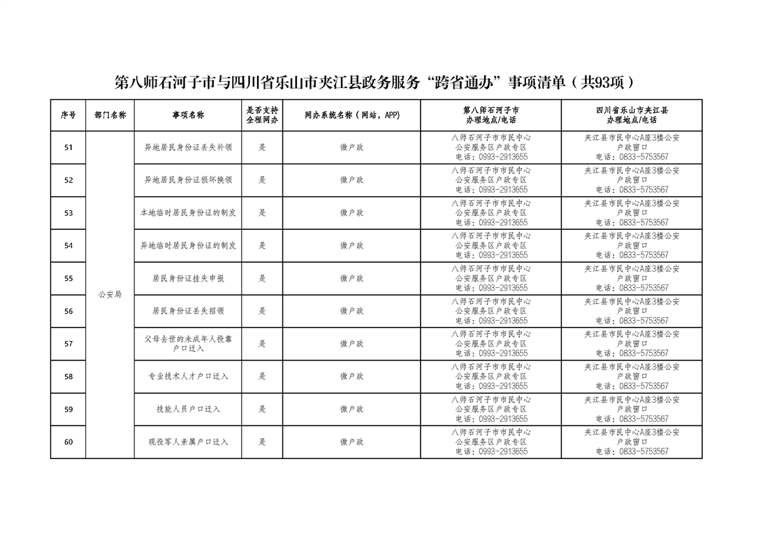 八师石河子市与四川省乐山市夹江县“跨省通办”事项清单(共93项)